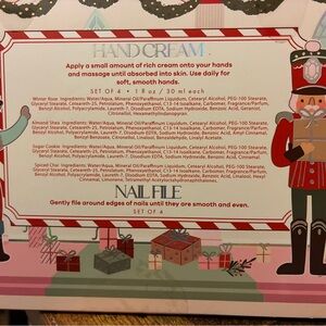 holiday-themed hand cream set that includes four moisturizing lotions in scents like Winter Rose, Almond Shea, Sugar Cookie, and Spiced Chai, along with nail files