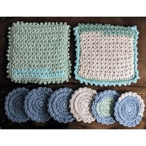 Add a touch of handmade charm to your kitchen or dining area with this delightful set of crocheted potholders/coasters! Lovingly handcrafted from 100% cotton, this set features a beautiful colorblock design in soothing aqua, teal, and blue tones.