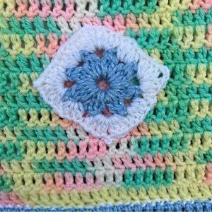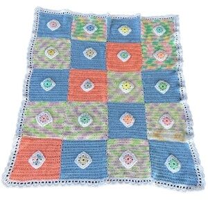 Hand Crocheted Pastel Afghan. With multicolor square blocks, slightly raised flowers and a White scalloped edge. Some of the yarn has shimmer threading. Great preowned condition with some visible yarn tie-off a on the back side, but nothing major.