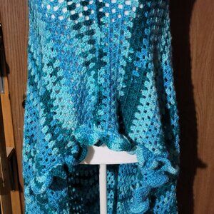 One Size Soft, Crocheted - Medium weight, Floor Length * Blue Black, & White, Large Plaid Color Pattern Deep -V Neck With Closure “Sleeves” About Wrist Length. New. Never Worn. No Tags