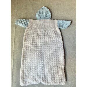 This hand-crocheted baby bunting provides comfort and warmth with its soft yarn and button closure. The hood and charming duck buttons add a delightful touch, making it both functional and aesthetically pleasing for infants.
