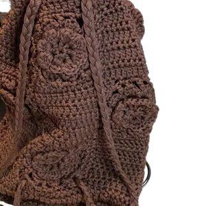 Hand Crocheted Chocolate Brown Backpack Flowers and Braided Straps