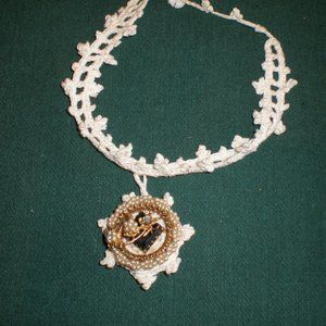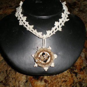 Hand Crocheted Choker Pendant Necklace w/Large Antique Button, Pearls Etc.