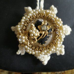 The antique button is 1 3/4" in dia. Encrusted with tiny pearls, Gold, Rhinestones and black onyx. The button is firmly set on a crocheted background. It is truly a one of a kind artisan piece that is beautiful.