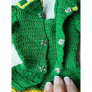 Hand crocheted green and yellow flamenco dress for 21” doll. Fabulous construction with good design and quality cotton crochet material. Great bodice with square neckline and collar with complimentary trim color. Red shoes accent the outfit perfectly.