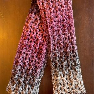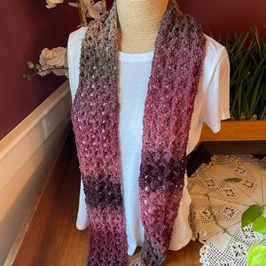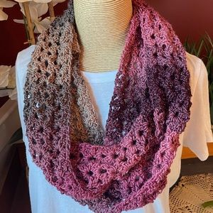 Hand crocheted infinity scarf. Beautiful color variation of pink, purple, mauve and tan with a pink sparkle throughout. Approximately 63 inches long by 5 inches wide. Made with Hobbii Universe yarn. 98% acrylic and 2% polyester