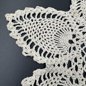 This intricately hand-crocheted star-shaped doily embodies vintage charm, showcasing delicate craftsmanship and timeless beauty. Its beige tone adds a classic touch to any décor.