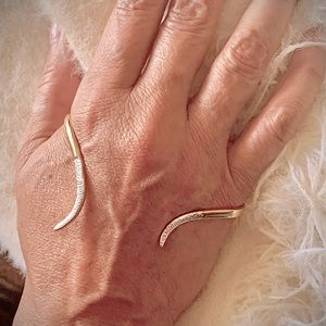 Found this at a Boutique. Great conversation piece, for it’s very comfortable & easy to put on this piece has no markings . so I’m not sure of the material. Never tarnished stayed in great condition