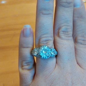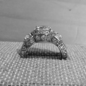 Hand Cut CZ Solid 925 Sterling Silver w/ Rhodium Three Stone with Pave' CZs on side.