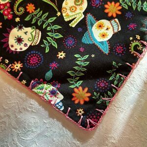 Hand crafted using a cotton sugar skull fabric and backing it with a green flannel fabric