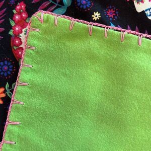 Hand crocheted (or embroidered) around the edges with pink thread