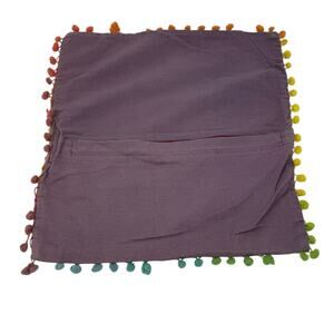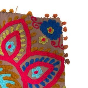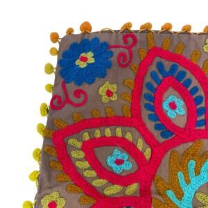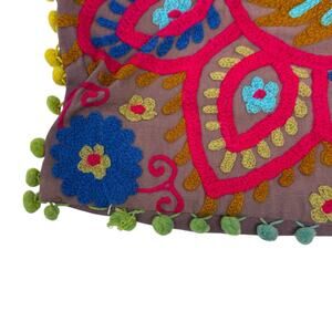 Add a touch of global charm to your home decor with this beautiful, hand-embroidered pillow cover with pom pom edges!
