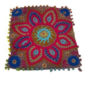 Hand Embroidered Decorative Square Pillow Cover Bohemian Boho Style 15 x 16 in