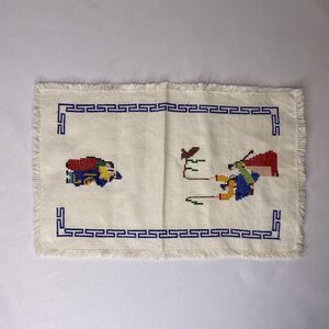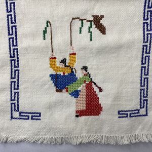 Hand Embroidered Finger Tea Towel Asian Design Fringe 14 x 9 Cross Stitch