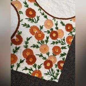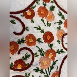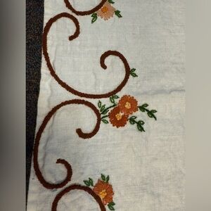 Hand Embroidered Floral Linen Tablecloth EUC 72 X 52 Rectangle Green, Brown, Tan