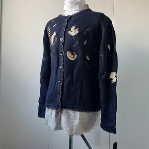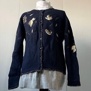 Hand Embroidered Golden threads and Leaves Navy Holiday Cardigan cotton blend