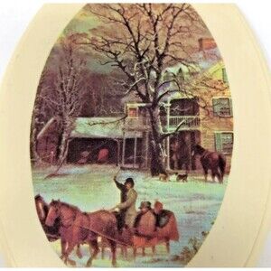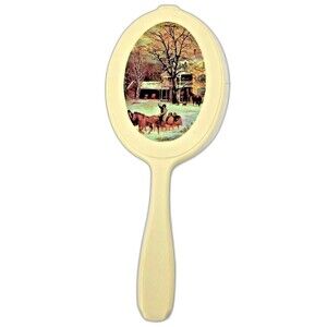 VTG Hand Held Vanity Mirror hard Plastic Farmhouse Dashing Snow Scene, perfect for a hanging wall collection of vanity morrors.