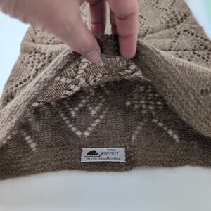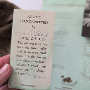Beautiful hand-knit smoke ring scarf made from 100% qiviut, the rare underwool of domestic musk ox. This scarf is a product of the Oomingmak Musk Ox Producers' Cooperative, a unique Arctic home industry derived from native art. Brand new and comes with all pamphlets and details. This scarf measures 18.5 x 12.5 inches. A true treasure from Anchorage, Alaska!