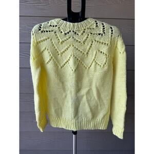 This handmade cardigan features an intricate chevron-style openwork yoke design and is knit in a butter yellow acrylic yarn. In very good condition with pearlescent buttons and no visible flaws. Measures 17.5" flat across the chest, which best fits a women’s XS or slim S. A charming vintage-inspired piece perfect for layering in any season.