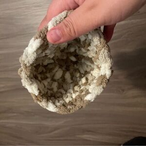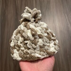 Cozy chunky knit beanie in cream and brown. Perfect for cold weather.