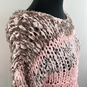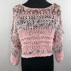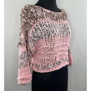 Hand Knit Dollie Pink Brown Chunky Crochet Fuzzy Knit Pullover Crop Sweater XS