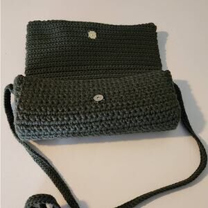 Hand Knit Green Crocheted Crossbody Purse with Floral Rosette Flap Closure