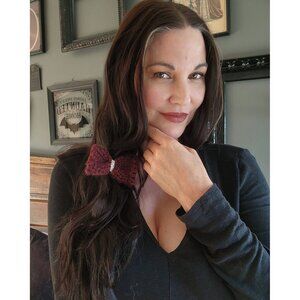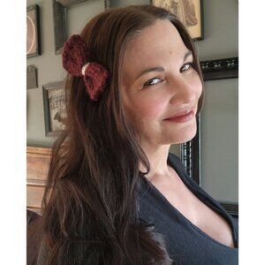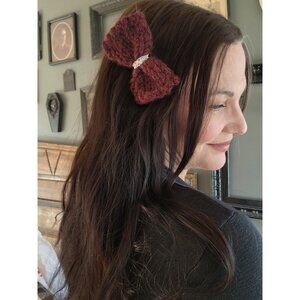 Handknit and charming, here's a handknitted hair bow in a deep red I'm calling the "Vamp". Featuring vintage white lace in the center and knitted on a standard metal hair clip, its incredible easy to put in your hair and creates a unique look in seconds! Super cute added anywhere to any hair style and adorable in a big messy bun as well. This is my small size bow, it measures about 4" wide and 2.5" tall. I am happy to do custom colors, and please see our listings for others we have in stock as well as my large size bows on black ponytail holders.