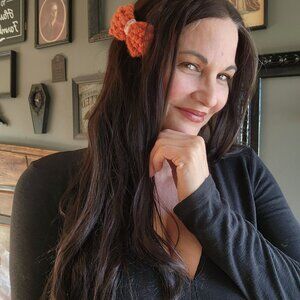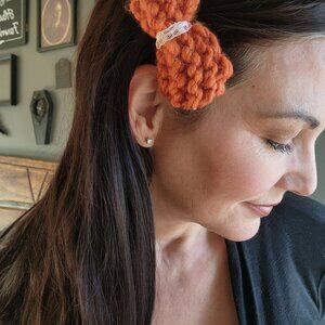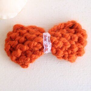 Handknit and charming, here's a handknitted hair bow in a rich orange I'm calling the "Fallen Leaf". Featuring vintage white lace in the center and knitted on a standard metal hair clip, its incredible easy to put in your hair and creates a unique look in seconds! Super cute added anywhere to any hair style and adorable in a big messy bun as well. This is my small size bow, it measures about 3.5" wide and 1.75" tall. I am happy to do custom colors, and please see our listings for others we have in stock as well as my large size bows on black ponytail holders.