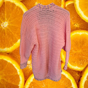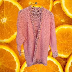 Hand Knit Open Front Long Pink Sweater With Colorful Accents