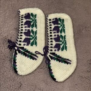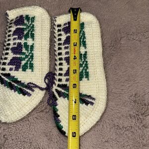 Hand Knit Socks, Wool Socks Slipper Socks, Purple Flowers Womens Size 7-8