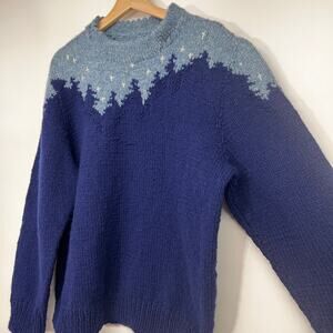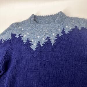Hand Knit Starry Night Sky Wool Sweater Blue Skyline Trees Mountains