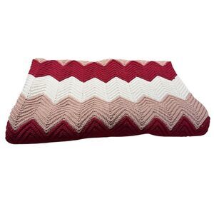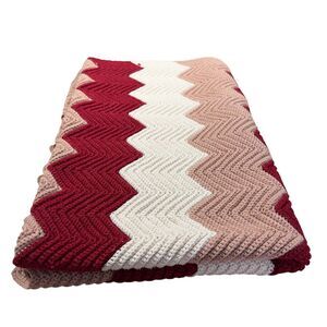 Hand Knit Throw Afghan Blanket Chevron Pattern Red Ivory Pink 48" x 66" Cozy Heavyweight