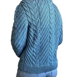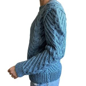 Hand Knit Womens Blue Cable Chunky Knit Fisherman Style Crewneck Sweater Sz M