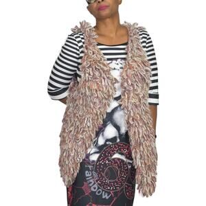Anthropologie Hand Knit by Dollie Sherbet Loop vets FEATURES a shggy looped yarn in a trio of light colors. Relaxed oversized fit. Open front. V neck. Hip length. Sleeveless.