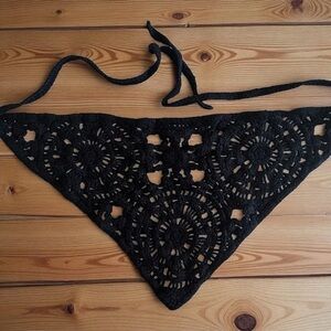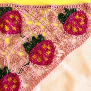 Hand Knitted 4 Head Scarf Set - Black, Cream, Pink Strawberry Cream Mushroom Wonderful head scarves notch up your bed head days and make your hair look amazing. Hand knit with acrylic yarn. Hand wash and reshape and lie flat to dry. Size is approximately 19”-21” by 13”-14” Featuring intricate lace like patterns in black, cream, and strawberries in cream, yellow, green and pink, and red and cream mushrooms. Set of four.