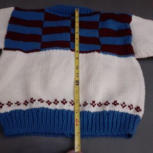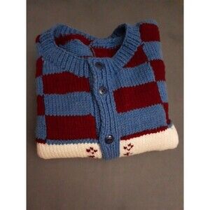 Hand Knitted Cardigan Child Sweater Blue Maroon White Pattern Hand Handmade M L