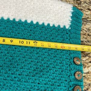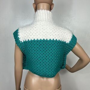 Hand Knitted White Turquoise Short Sleeve Turtleneck Crop Sweater Size XS/S