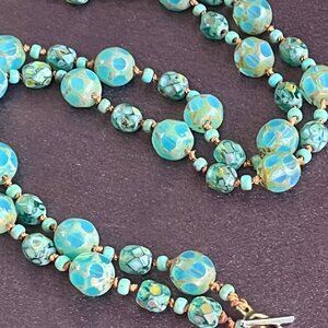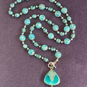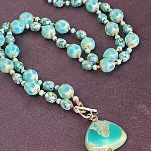Hand Knotted Czech Glass Bead Necklace with Aqua Turquoise Pendant