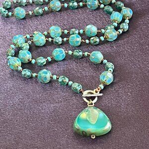 This hand knotted artisan necklace is a beautiful blend of earthy elegance and bohemian charm. Each Czech glass bead in aqua, turquoise, and soft green tones is carefully hand knotted for durability and a smooth, luxurious drape. The strand is finished with a Czech glass triangular Picasso finish pendant, glowing in aqua with rustic bronze accents, and secured in front with a toggle clasp.
