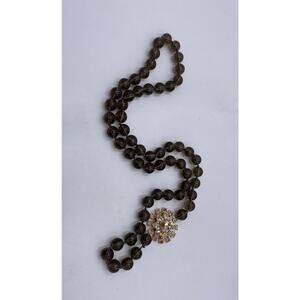 Hand Knotted Long Smoky Quartz Glass Beaded Rhinestone Flower Accent Necklace