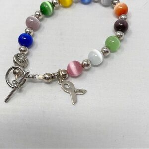 Beautifully hand made excellent quality multi color cats eye moonstone beaded toggle closure bracelet with sterling silver 925 breast cancer ribbon charm