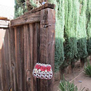Hand Made Clutch Purse With Shoulder Strap: This is a one of a kind hand-sequined clutch purse. The Roses theme is lovely and features tons of beautifully colored beads. The purse interior is gray. A classic thin shoulder strap completes this very chic accessory. This piece will complement formal, informal or casual outfits.