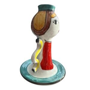Very good preowned condition. This handmade and hand painted made in Italy. Candleholder is in the style of Giovanni Desimone.. this piece is signed and numbered. A colorful piece with blue trim at the bottom and top. She is wearing a red dress and has tan and brown hair not to mention Ruby red lips. There is an area in the candle hole opening that looks to have been chipped and repaired, see the last photo. It is not noticeable from the front of the candle holder. On the bottom, what looks at first glance to be a crack is actually just a paint mark. No other chips or cracks have been seen. The measurements are approximately 5 3/4 inches tall, the candle is approximately 4 inches in diameter at the base, the head is approximately 2 1/4 inches and the candle hole opening is 1 inch. Super cute in the primitive art way.