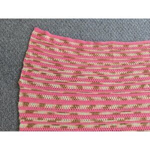 This hand-made crochet knit afghan throw adds warmth and style to any space. Perfect for cozying up on the sofa or as a decorative touch. Its pink hues create a soothing ambiance.