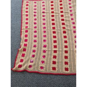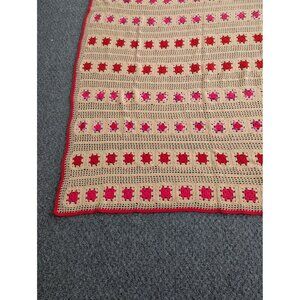 Hand Made Crochet Knit Afghan Throw Lap Blanket 64" x 60" Tan Pink Red