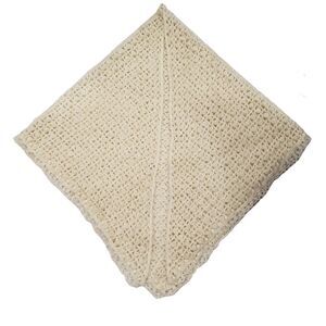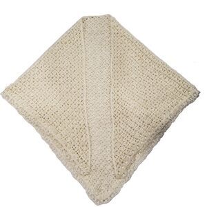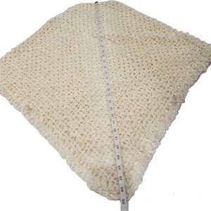 Hand Made crochet Shawl with Ribbon Trim and Ball detail throughout. I'm unsure about the material. Approximate 61 inches across the top