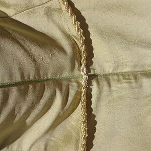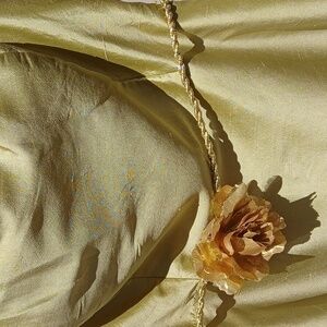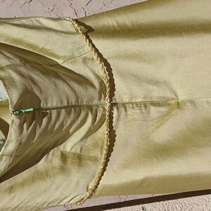 Hand Made Elegant Goldish Lime Strapless Dress Sz Small. Gold belt with gold flower. May be Silk/taffita fabric. Removable flower to wear in your hair. Shine in this elegant Golden strapless dress, perfect for any occasion. Fully lined, built in bra, hidden zipper. Has a spot on front, needs to be cleaned, see last picture. The dress features a flattering silhouette and a charming floral accent. Ideal for adding a pop of color to your wardrobe. pit to pit 16", waist 14", top to bottom 37".