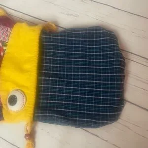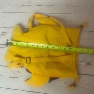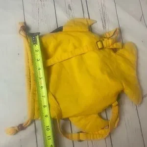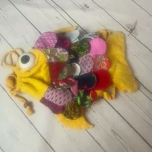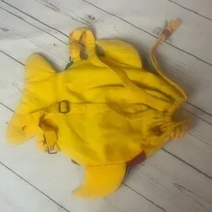 Hand Made Fish Backpack. Colorful fabric backpack in the shape of a fish with yellow back and straps and multicolored scales on front. Drawstring closure