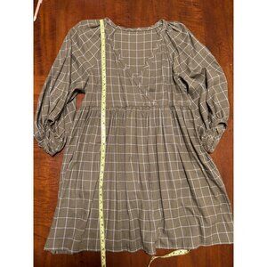 Made from a 60% cotton 40% viscose blend olive green and white window pane print fabric. Design is based on McCalls M7969 pattern. Wrap front detail, gathered skirt and peasant sleeves. Beautifully finished with French seams throughout, this dress is higher quality than you could buy off the rack! Wash in cool water and let air dry.