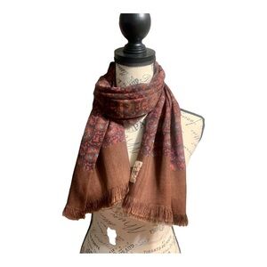 Hand Made Pure Silk Scarf Blocked Paisley Printed Brown Fringe Imported Soft OS